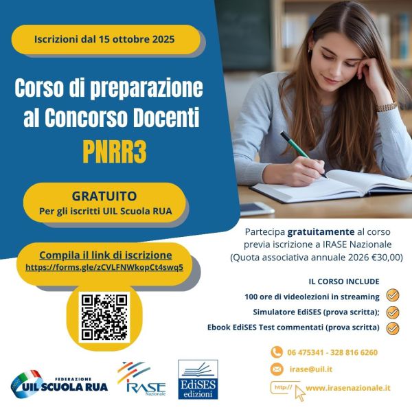 Dal 15 OTTOBRE 2025 sarà possibile iscriversi al corso di preparazione alla prova scritta del concorso “PNRR3”, organizzato da Uil Scuola Rua e IRASE Nazionale. In questa pagina gli aspiranti docenti potranno trovare tutte le informazioni sulla nostra proposta formativa riassunta nei documento allegati.