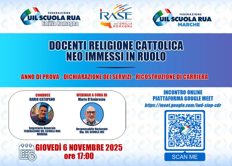 La FEDERAZIONE UIL Scuola RUA Emilia Romagna e la FEDERAZIONE UIL Scuola RUA Marche in collaborazione con IRASE nazionale (Ente qualificato per la formazione del personale della Scuola – decreto MIUR prot. n. 1222 del 05.07.05 – 1 dicembre DIRETTIVA 170/2016) e IRASE REGIONALE dell’EMILIA ROMAGNA promuove il seguente webinar destinato al personale docente di religione cattolica: