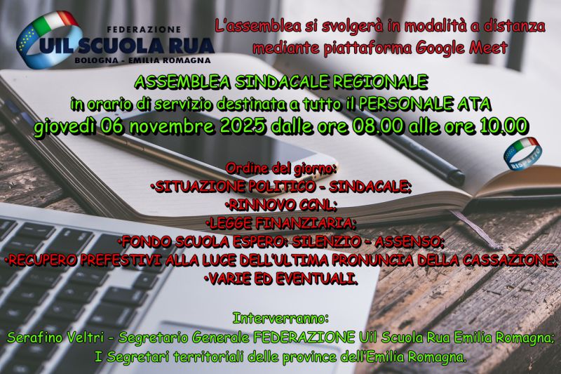 La FEDERAZIONE UIL Scuola RUA dell’Emilia Romagna indice una ASSEMBLEA SINDACALE REGIONALE in orario di servizio destinata a TUTTO IL PERSONALE ATA DELLA SCUOLA per il giorno 06/11/2025 dalle ore 08.00 alle ore 10.00, con il seguente ordine del giorno: