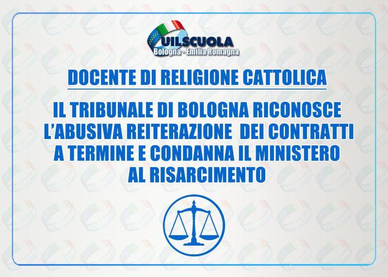 Il Tribunale di Bologna accogliendo il ricorso presentato da un docente di religione cattolica, promosso dalla UIL Scuola di Bologna e patrocinato dagli Avv.ti Domenico Naso e Cinzia Ganzerli, con la sentenza del 05 marzo 2026, ha accertato l’illegittimità della condotta del Ministero dell’Istruzione e del Merito condannandolo al pagamento dell’indennità risarcitoria di cui all’art. 12, del D.L. 16 settembre 2024, n. 131 di modifica dell’art. 36 del D.lgs. 30 marzo 2001 n. 165, in favore della parte ricorrente pari a 24 mensilità dell’ultima retribuzione globale di fatto, oltre alla maggior somma tra rivalutazione monetaria e interessi di legge dal deposito del ricorso al saldo.